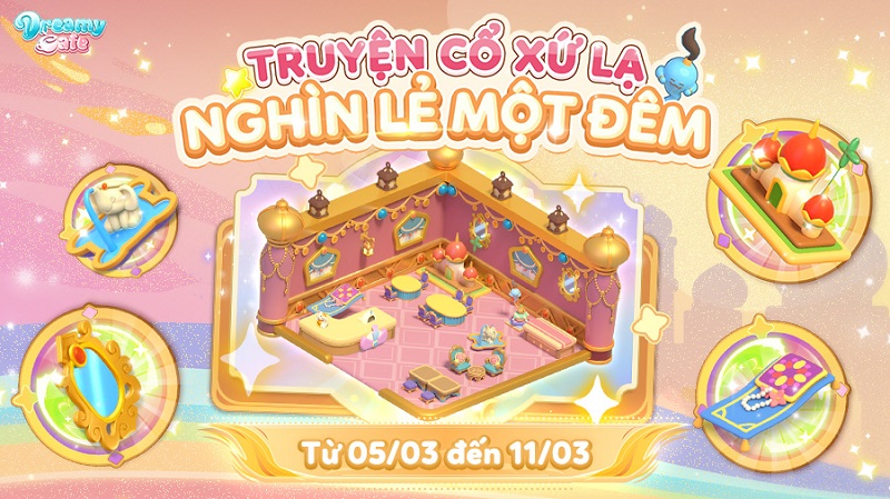 Người chơi Dreamy Cafe có thể sở hữu bộ nội thất Nghìn Lẻ Một Đêm đầy chất huyền bí Ba Tư khi tham gia sự kiện mới sắp tới trong game.
